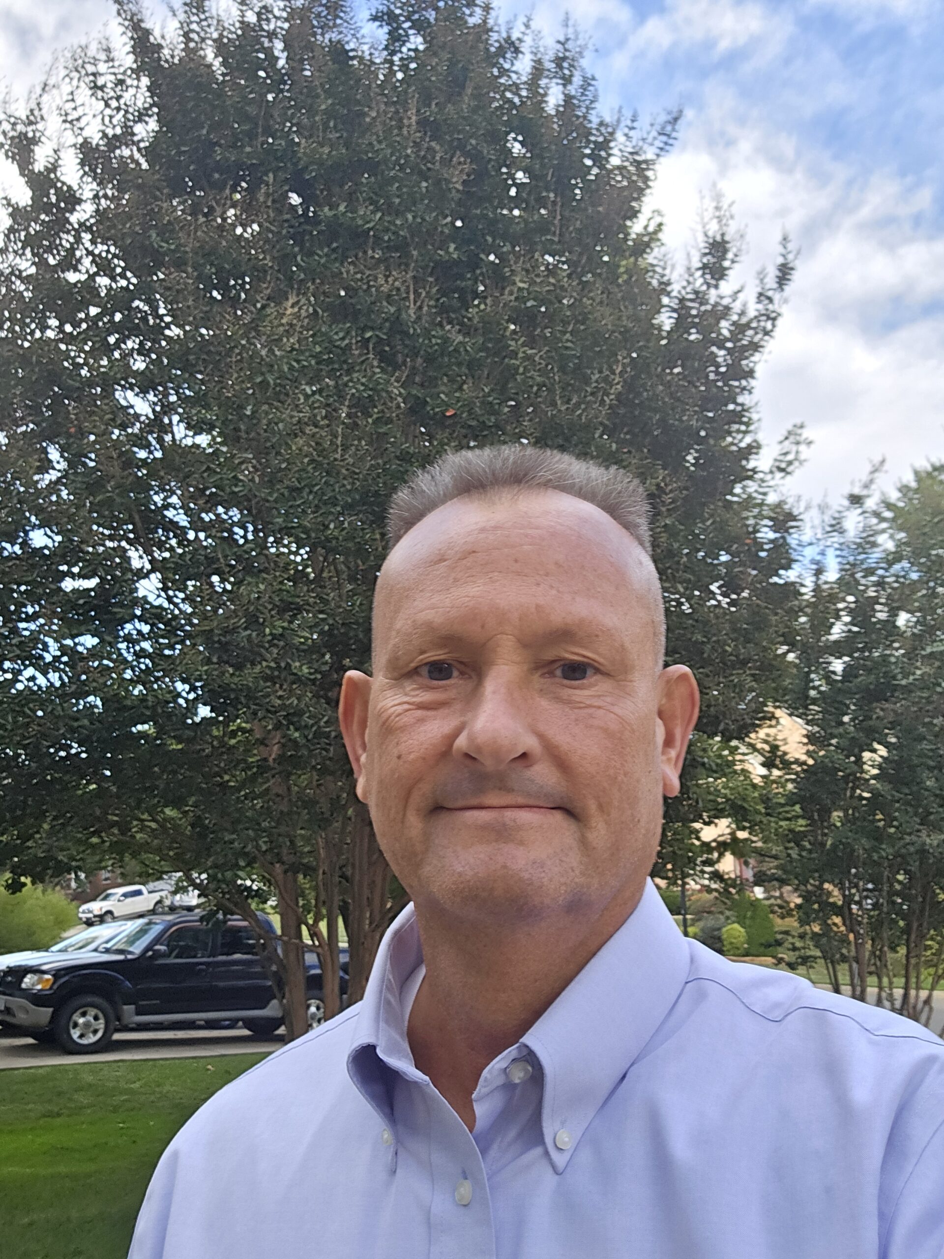 Barry Winebarger, portrait, outdoors, wearing a light blue button-down shirt with a tree and blue sky backdrop.